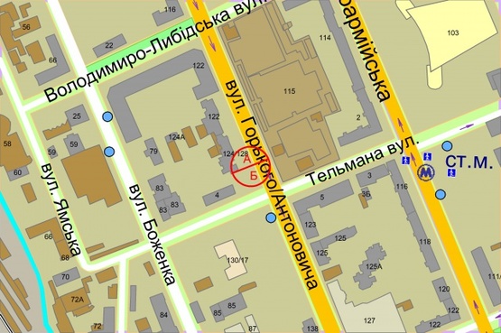 - Адрес: Антоновича (Горького), 124/128, зупинка "Володимирський ринок" (світлофор)