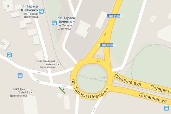 - Адрес: Тараса Шевченка пл. - Івана Сергієнка вул. (в напр. Подола)