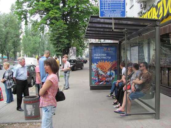 Заказать Реклама на остановке в г. Киев по адресу Лесі Українки бульв., 17-19 (ресторан "Євразія", дитячий магазин "Антошка");_зупинка громадського транспорту можно позвонив менеджерам по телефонам: +38(099) 395-28-27, или через форму онлайн заявки