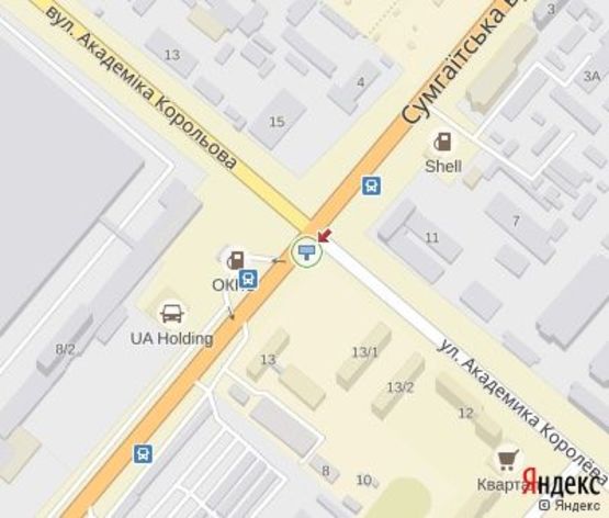 - Адрес: Сумгаитская ул., - Королёва ул., (АЗС OKKO , Автосалон UA Holding, завод "Богдан")