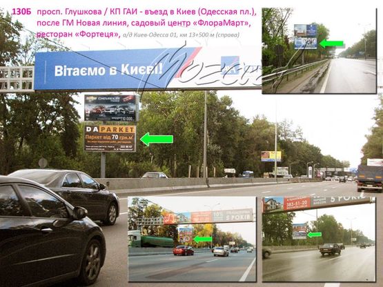Билборд в г. Трассы на просп. Глушкова / КП ГАИ - въезд в Киев (Одесская пл.), за ГМ Новая линия, садовый центр "ФлораМарт", заезд к ресторану-отелю "Фортеця", а/д Киев-Одесса 01, км 13+500 м, справа