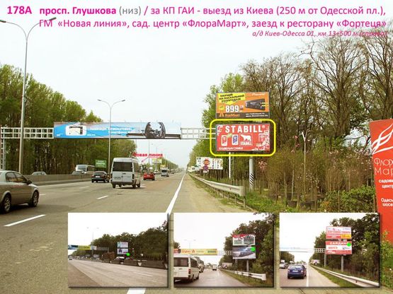 Билборд в г. Трассы на просп. Глушкова / КП ГАИ - выезд из Киева (Одесская пл.), ГМ Новая линия, садовый центр "ФлораМарт", заезд к ресторану-отелю "Фортеця", а/д Киев-Одесса 01, км 13+500 м (справа) низ