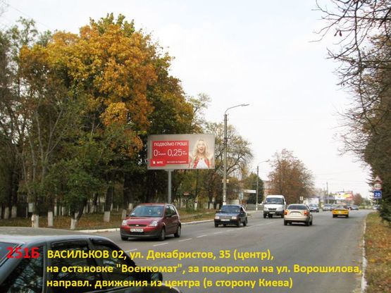 Фото рекламной плоскости по адресу Васильків, вул. Декабристів, 43 (центр), зупинка "Військомат", ВВАТУ (авіаучилище), пам'ятник "Винищувач МиГ-21", за поворотом в бік вул. Івана Мазепи, напрямок з центру (в бік Києва)