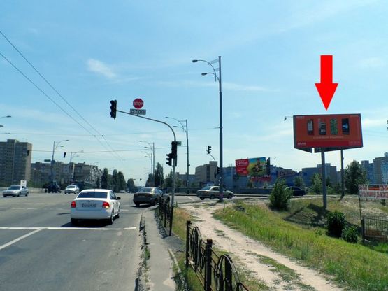 Билборд в г. Киев на ул. Драйзера / ул. Бальзака - на светофоре, с/м Сильпо, Фокстрот, Космо (ТЦ Сириус), направление от ул. Радунской в стор. пр. Маяковского, загруженная трансп. развязка