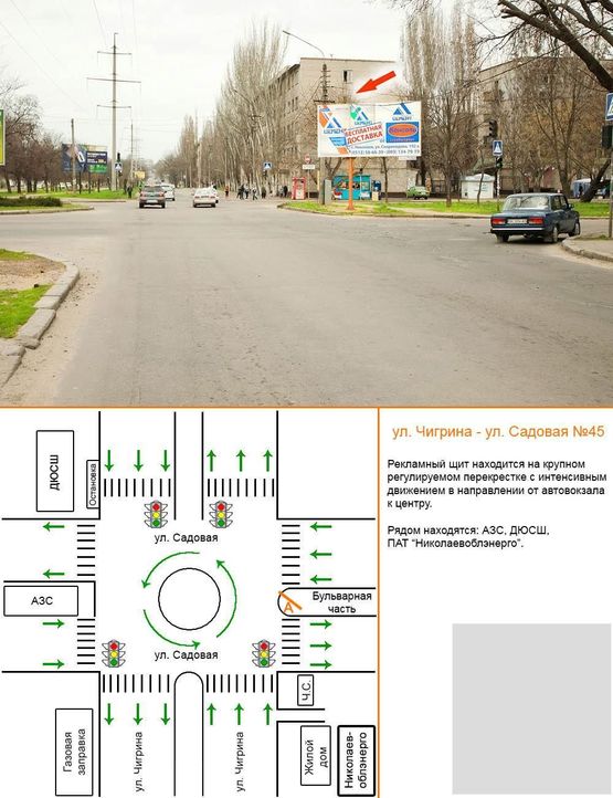 Заказать Билборд в г. Николаев по адресу ул.Чигрина-ул.Садовая можно позвонив менеджерам по телефонам: +38(099) 395-28-27, или через форму онлайн заявки