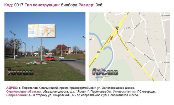 Заказать Билборд в г. Переяслав-Хмельницкий по адресу просп. Червоноармійців та вул. Золотонішське шосе можно позвонив менеджерам по телефонам: +38(099) 395-28-27, или через форму онлайн заявки