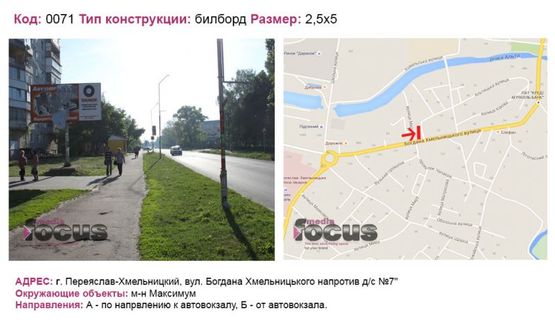 Заказать Билборд в г. Переяслав-Хмельницкий по адресу вул. Богдана Хмельницького (около д/с №7") можно позвонив менеджерам по телефонам: +38(099) 395-28-27, или через форму онлайн заявки