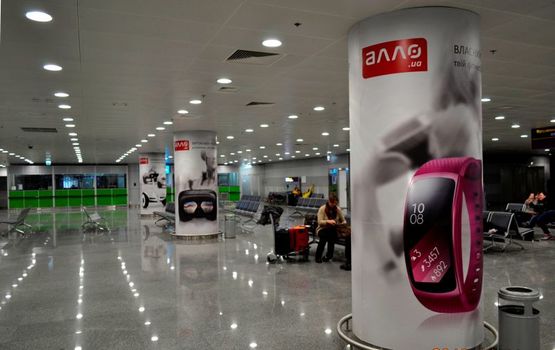 Заказать Нестандартная конструкция в г. Борисполь по адресу Терминал D. Зона вылета внутренние рейсы. Брендирование колонн в зале регистарции вылета (пакет из 4 шт.) можно позвонив менеджерам по телефонам: +38(099) 395-28-27, или через форму онлайн заявки