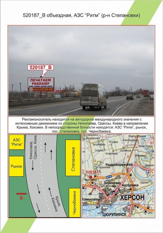 Заказать Билборд в г. Херсон по адресу В'їзд-виїзд, об'їзна, АЗС Ритм ( р-н Степанівка), можно позвонив менеджерам по телефонам: +38(099) 395-28-27, или через форму онлайн заявки