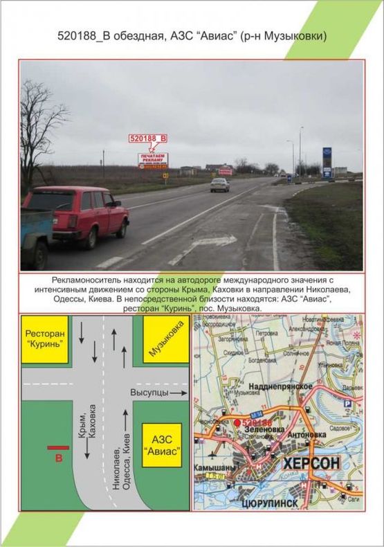 Заказать Билборд в г. Херсон по адресу В'їзд-виїзд, об'їзна, АЗС Авіас ( р-н Музиківка), можно позвонив менеджерам по телефонам: +38(099) 395-28-27, или через форму онлайн заявки