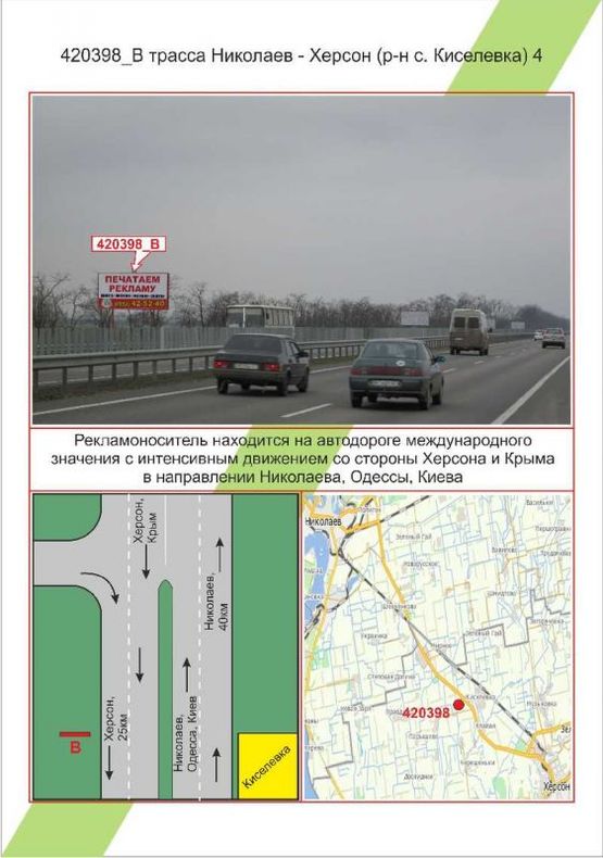 Билборд в г. Трассы на траса Миколаїв – Херсон (р-н с.Киселівка) 4, ,
