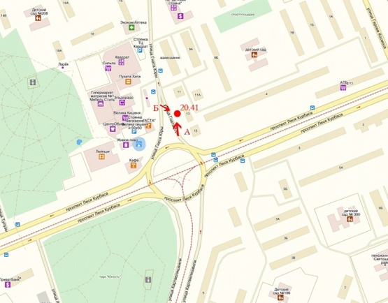 Схема рекламной плоскости по адресу Гната Юры 13, ТЦ "Квадрат" "Дитяча країна" "Ельдорадо", кинотеатр "Лейпциг", БЦ "Жизнь и Право", "Сильпо", "Велика кишеня"