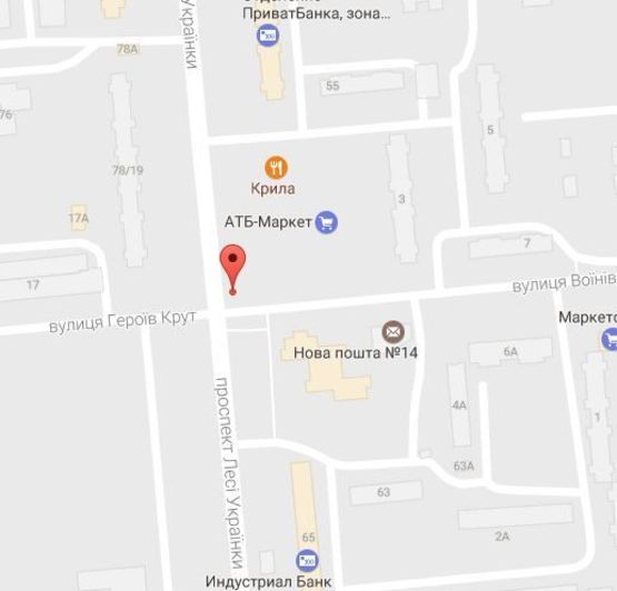 - Адрес: просп. Л.Украинки (просп. 50-лет. Октября), 78/19, район перекрёстка с ул. В.Интернационалистов