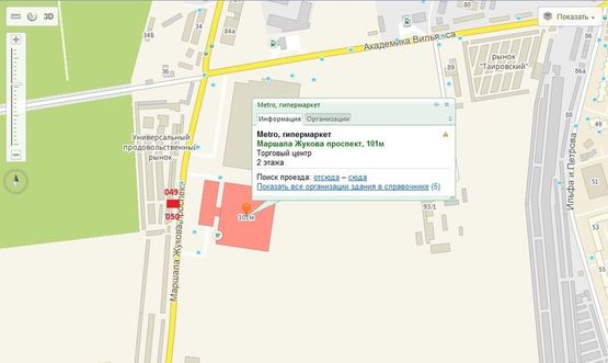 - Адрес: пр-кт М. Жукова - ул. Ак. Вильмса (напротив ТЦ "МЕТРО", строительного гипермаркета "ЭПИЦЕНТР" - рядом продовольственный рынок "Черноморский"