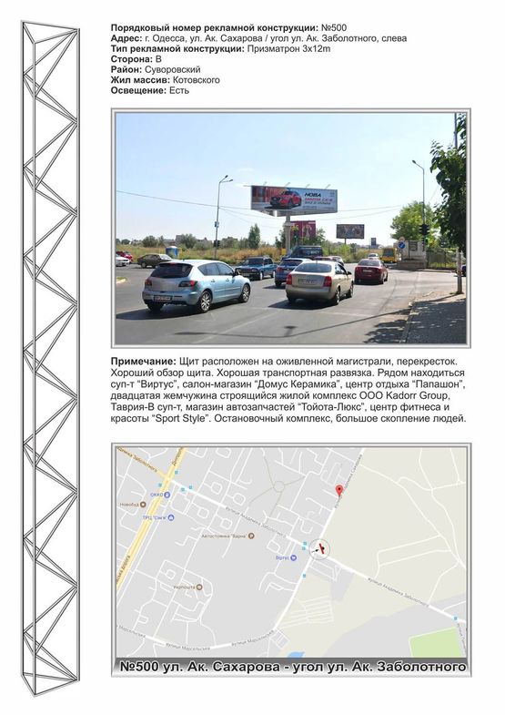 Билборд в г. Одесса на (а)№500лев ул. Сахарова/ ул. Заболотного
