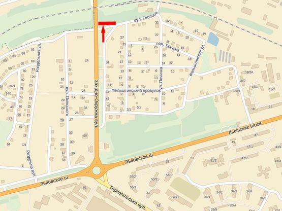 Т-подібне перехрестя вул.Проскурівського підпілля - вул.Вокзальна. неподалік: велика автостоянка, парк, приватна забудова (в центр) [праве вухо] А \ Нет 4600