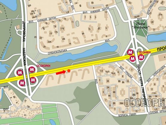 Схема рекламной плоскости по адресу Бажана пр., 14А, возле клиники "Борис", между ст. м. "Осокорки" и ст. м. "Позняки", в сторону Харьковская пл.
