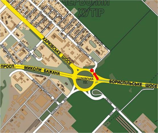 Брест-Литовське шосе, за 100 метрів до світлофора (розворот до аєродрому "ЧАЙКА"), рух в напрямку Киева, ліворуч Б \ Есть 12600