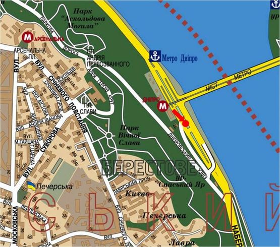 - Адрес: Набережное шоссе, ст. м. "Днепр", разделитель, в сторону мост Патона