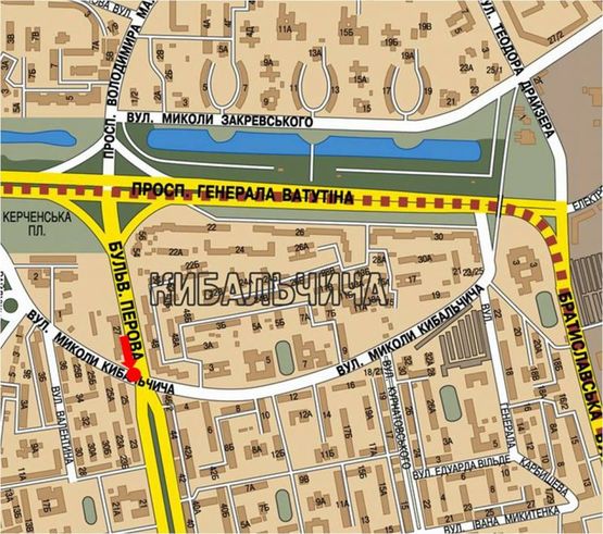 Схема рекламной плоскости по адресу Перова бул. / Кибальчича ул., разделитель, на светофоре, в сторону Броварского пр.