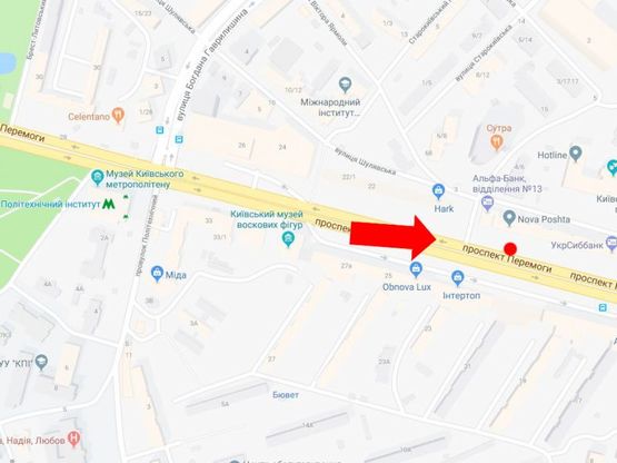 - Адрес: Победы пр., 20, банки "ПУМБ", "Укрсиббанк", напротив магазинов "Интертоп", "Carlo Pazolini", "Adidas", в центр