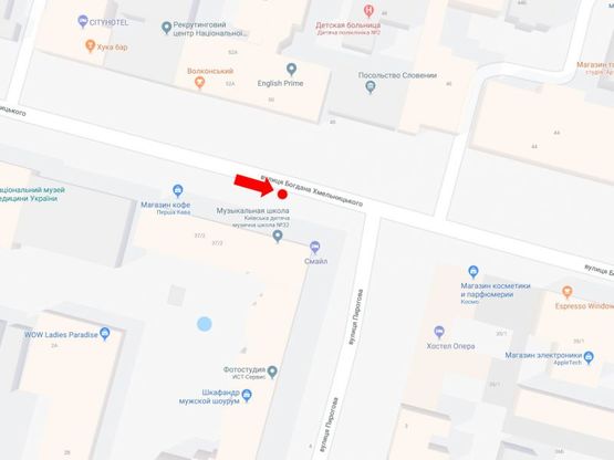 - Адрес: Хмельницкого ул., 37/2 / ул. Пирогова, напротив посольства Словении, в сторону ул. Крещатик