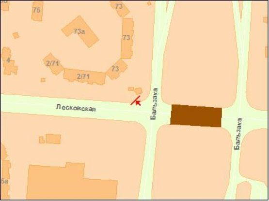 Схема рекламной плоскости по адресу Лесковская ул., 2/ 71 / О. Бальзака ул., напротив супермаркета "Новая Линия"