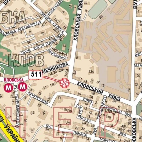 - Адреса: Кловский спуск, 14, (Правекс Банк, Укртрансгаз, "Bereznitsky Gallery", UniCredit банк, мото "Biker Store"), в направ. Московской ул.