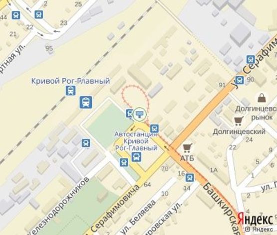 Схема рекламної площини за адресою Железнодорожников ул., 17 - Башкирская ул. (ЖД Вокзал ст. "Кривой Рог - Главный", конечная МТС)