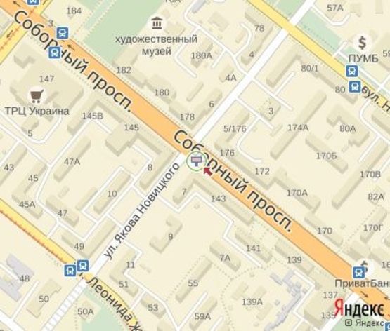 Схема рекламної площини за адресою Соборный пр.- Новицкого ул. ЦЕНТРАЛЬНАЯ ЗОНА (напротив "Райффайзен Банк Аваль")