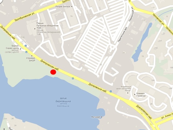 - Адреса: Дніпровська набережна, 540м до залізничного моста