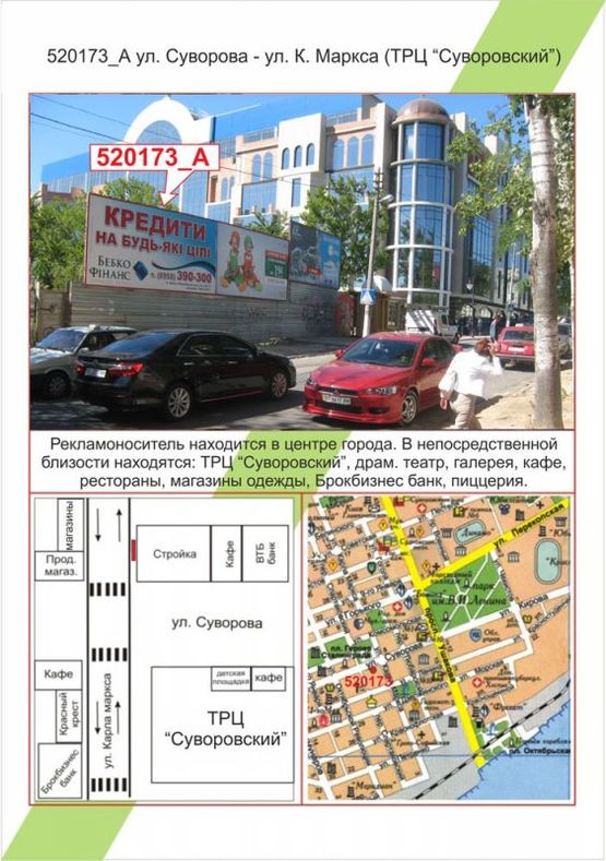 - Адреса: Центр, вул.Суворова - вул. Карла Маркса (ТРЦ Суворовський,