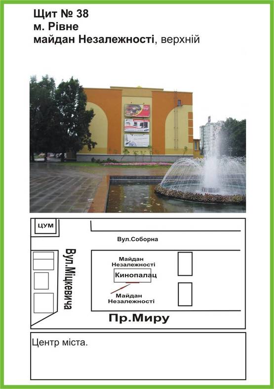 Замовити Білборд в г. Рівне за адресою майдан Незалежності, на стіні (верхній) можна зателефонувавши менеджерам за телефонами: +38(099) 395-28-27, або через форму онлайн заявки