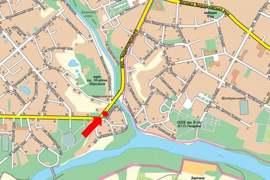 - Адреса: Чудновская ул. (бывш. ул. Черняховского) / ул. Набережная, возле моста, в центр