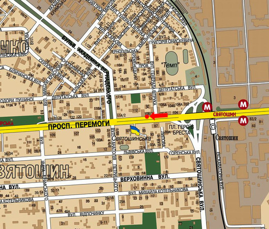 - Адреса: Победы пр., 108/ 1, напротив супермаркетов "Сильпо", "Фокстрот", ст. м. "Святошин", из центра